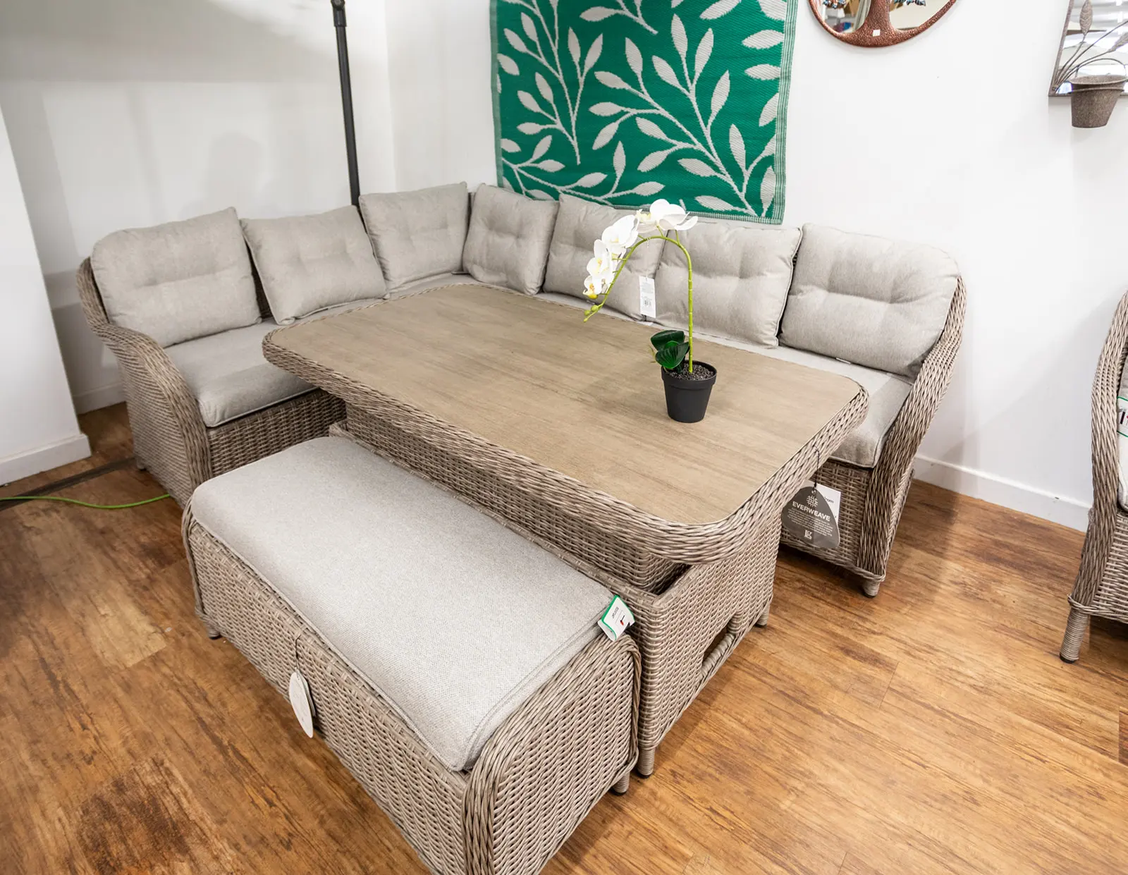 Luxurious wood-effect ceramic glass tabletops complement natural-toned cushions, creating a sophisticated and versatile look for any outdoor space. Cushions are crafted with Eden season-proof fabric, delivering water-repellent, UV-resistant, and quick-drying performance. Thanks to the StainSafe coating, everyday spills can be effortlessly wiped away with a sponge. For sustainable comfort, cushion fillings are made from EcoCore recycled plastic bottles—offering eco-friendly luxury without compromise. Elevate your outdoor living with the St Tropez Sand Collection, where style, durability, and easy-care performance come together seamlessly.